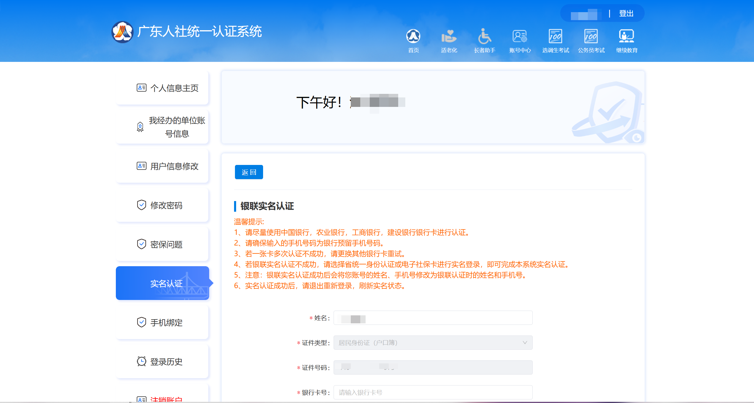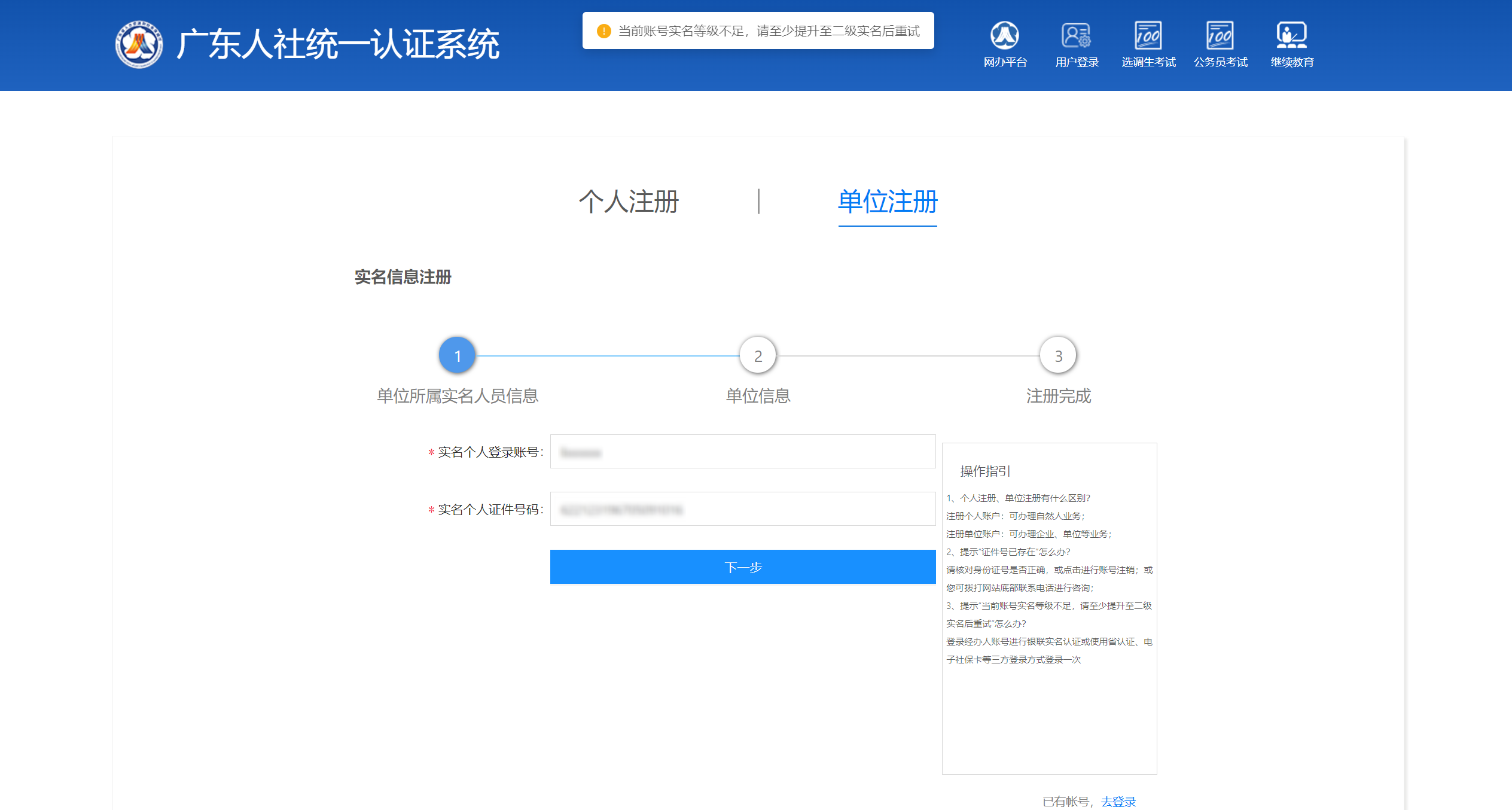 注册单位账号时输入个人账号后提示实名等级不足,如“当前账号实名等级不足,请至少提升至二级实名后重试”,解决此问题可通过省统一身份认证扫码实名,或者登录个人账号进行个人银行卡实名认证