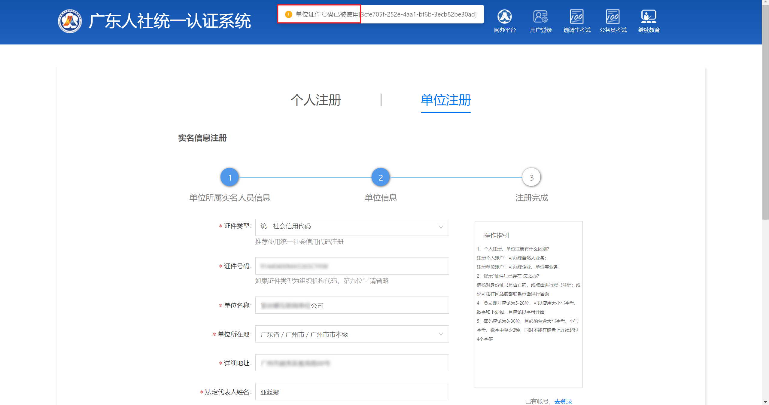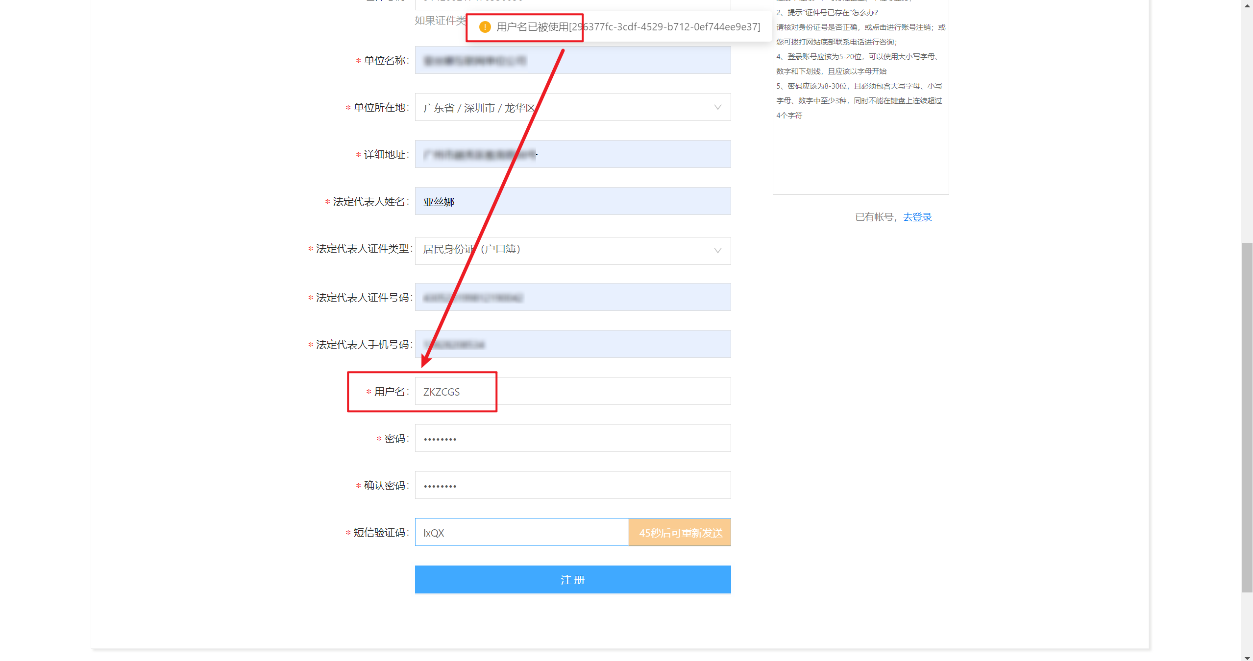 单位注册时提示如“用户名已被使用”,需修改用户名,填写未被使用的用户名