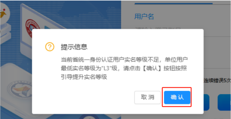 单位账号登录提示实名等级不足,如“省统一身份认证用户实名等级不足,单位用户最低实名等级为”L3”级,请点击[确认]按钮按照引导提升实名等级”,解决此问题需点击【确认】,按照引导填写信息提升实名等级