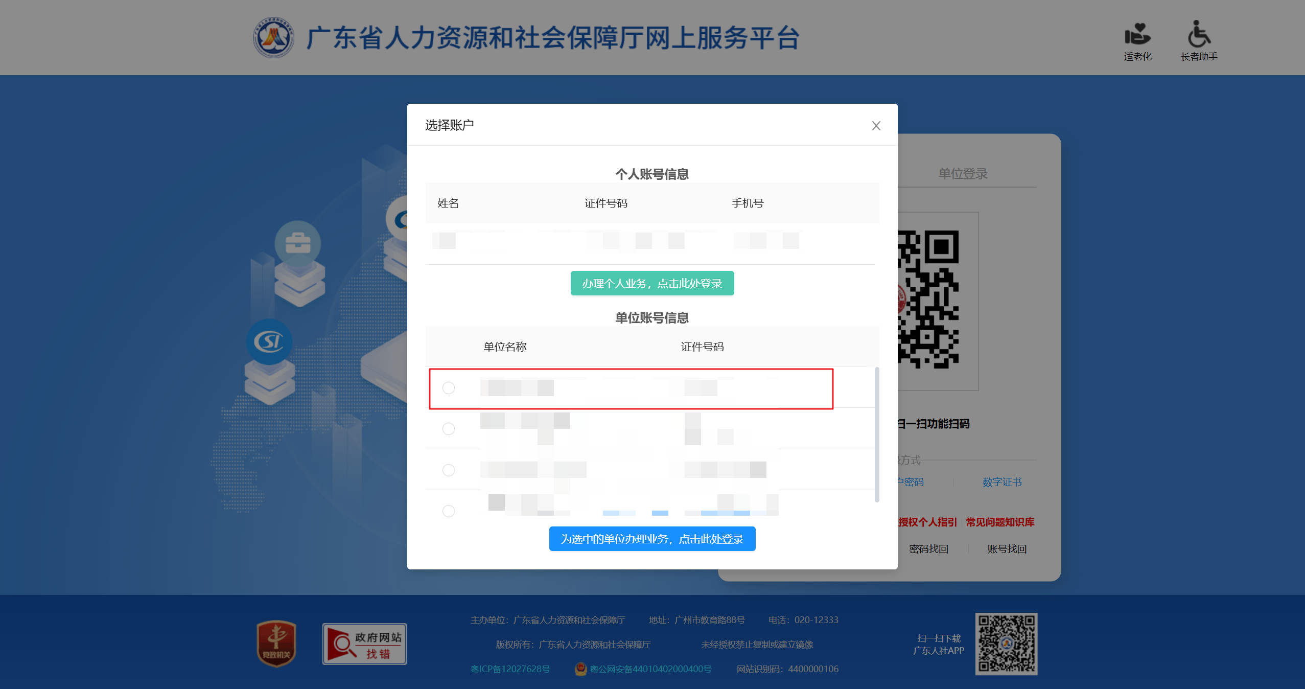 用个人账号登录时,选择对应的关联单位信息,点击“