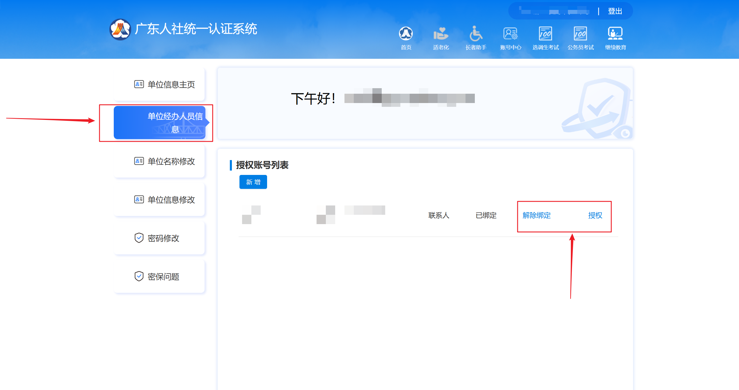 5.单位账号可以在“单位经办人员信息”处解绑单位经办用户;个人用户可以在“我经办的单位账号信息”处解绑本人的单位经办用户角色。