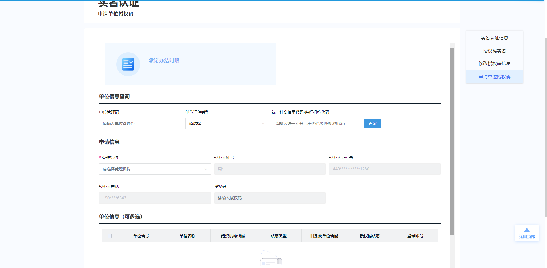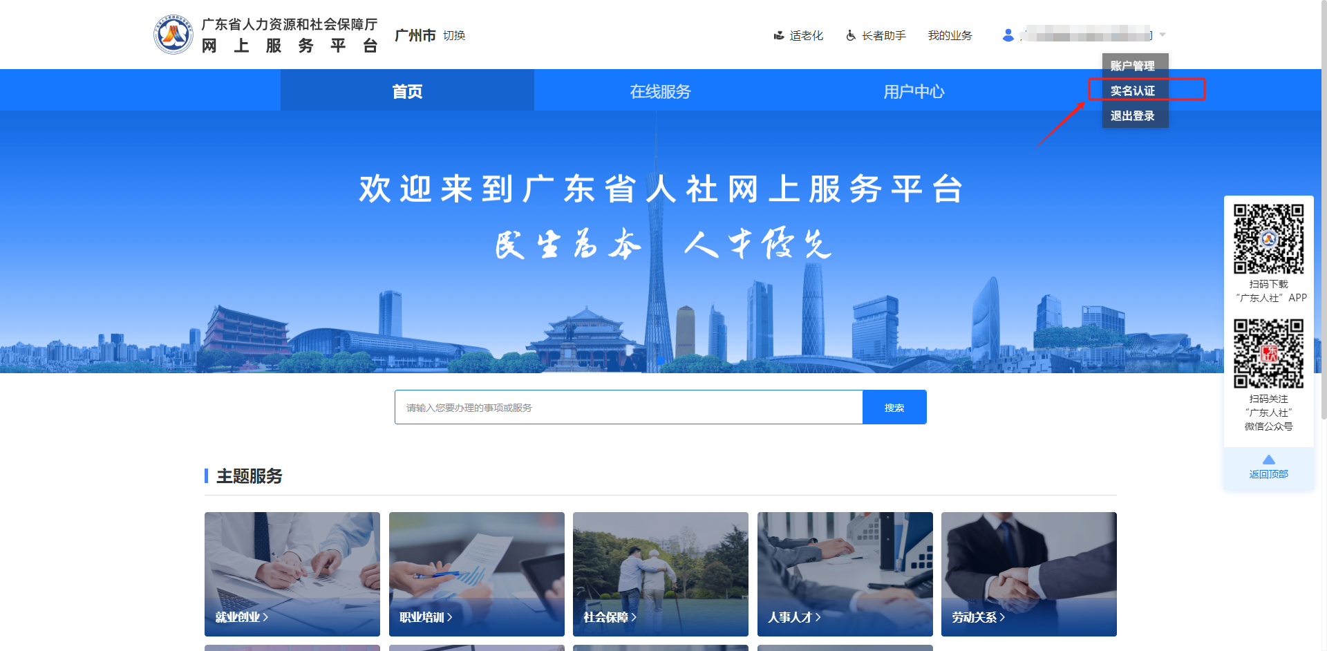 单位经办人员通过广东人社统一认证的个人账号登录,选择绑定单位信息后,进入网上服务平台,在页面右上角选择【实名认证】进入功能界面,选择右边浮框选择【申请单位授权码】,进行实名授权申请操作。